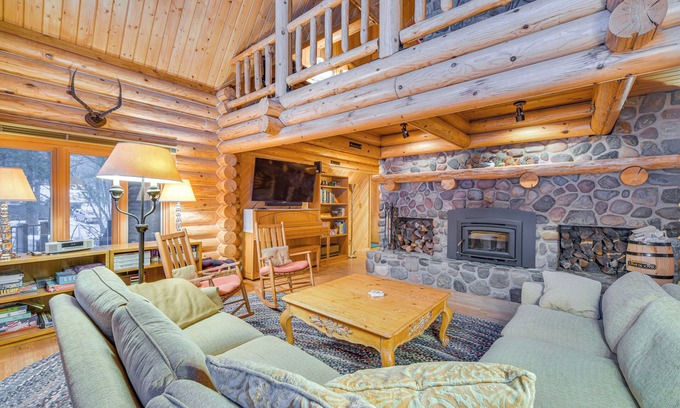 Year-round excitement and relaxation await at this 4-bedroom + bonus room, 5-bath Webster vacation rental! The log cabin has 2 living areas, a full kitchen, a yard with a playhouse for the kids, and on-site access to Big Sand Lake. Snowshoe along nearby trails in the winter or fish off the dock during the summer! After your adventures, unwind in the sauna, then gather in front of the fireplace for a group game night.