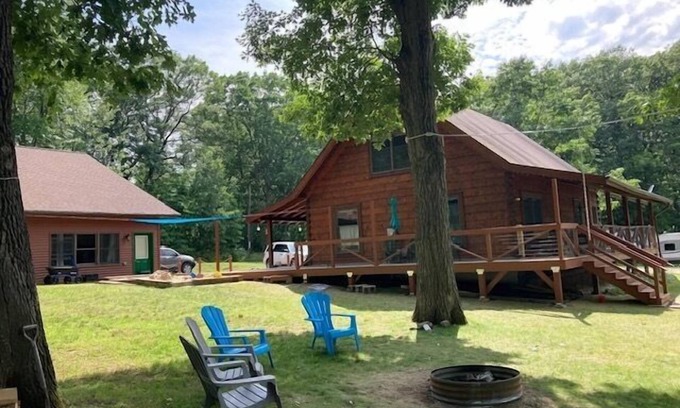 Your dream vacation awaits at Alpha's Round Lake Retreat! This open loft style log cabin with separate guest cottage features beautiful year round views of Round Lake from both inside and out. Alpha's Round Lake Retreat is cozy yet spacious and offers private Lake frontage and dock on all sports Round Lake. Offering great fishing, boating and swimming you'll find there's lots to do right out your front door. The wrap around deck and large yard provides even more space for family fun outside including a sandbox for the kids. Enjoy your morning coffee on the front porch swing while taking in beautiful views of the lake and grill your meals on the back porch while enjoying your favorite cold beverage of choice in the evening. After dinner, gather everyone around the fire pit for story time and roasting marshmallows.