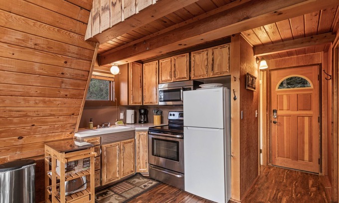 Welcome to your charming A-frame cabin in the woods! This little gem sits right on Lake Coeur d’Alene and offers lovely water views from the deck, where you’ll also find lots of comfy seating, a gas grill, and a patio heater. The stunning view continues inside, thanks to an entire wall of windows. This is a historic cabin, one of the first on Kidd Island Bay, and does include narrow stairways inside and bumpy footpaths outside. It is very common to see eagles, osprey, deer, and other wildlife from the deck. You’re just steps away from a sandy swimming beach managed by the local beach association. You also have access to a dock (shared with one other home), so if you’ve brought a boat, now might be the time to take it out for a spin. A canoe, stand-up paddleboard, and lifejackets are available on-site for use at your own risk.