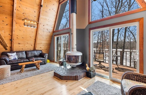 Brand new to Vrbo! Lakefront cabin on quiet North Pipe Lake—near Turtle Lake & Cumberland. Queen & full beds in loft + queen murphy & twin roll-away on lower level, where a glass garage door opens lakeside from a cozy bar/lounge. Main level has wood-stove & gathering kitchen. Step right outside to use a new Traeger Wood Pellet Grill or the barbecue fire pit. Enjoy a panoramic lake-view deck & screened-in porch. Have a cup of coffee sitting by the lake! Fish off the dock, paddle to the public beach on the connected Pipe Lake, or load your boat at the public landing and dock it here. 2 kayaks available for you to use. Year-round retreat near ski, snowmobile, & hiking trails. Ice-fishing convenience! Don't forget to swing by Louie's Finer Meats. Dogs ok! Pack 'n Play available.