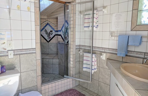 Our main house features a spacious suite with panoramic windows, offering views of the lake and mountains. This suite also includes a private entrance, deck, air conditioner, and ensuite bath.
