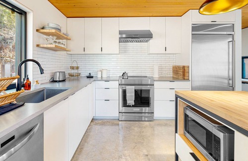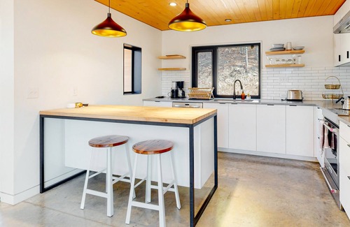 Inside, you’ll love snuggling on the leather sofa and keeping warm with help for the fireplace, whipping up meals in the well-appointed, and taking in the fantastic views.