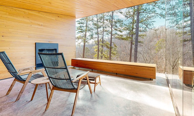 This Marlon Blackwell-designed retreat features stunning architecture and total seclusion. Perched upon a bluff overlooking Beaver Lake, the shoshugibon-clad cabin is surrounded by Beaver Lake and Hobbs State Park.