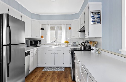 Our home is not just a place to stay, but a source of lasting memories. Modern amenities meet warm, inviting decor, creating a comfortable sanctuary for you and your loved ones. Enjoy breathtaking lake views through floor-to-ceiling windows and from the expansive multi-level deck. An open-concept kitchen and living room, complete with a wood-burning fireplace, create an intimate setting for shared meals and stories.