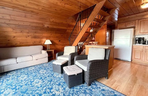 This Chalet welcomes you with a warm and inviting ambiance, promising a delightful retreat for your vacation. The main floor boasts a large common area, seamlessly combining the kitchen, dining area, and living room into a welcoming space where you can gather with family and friends. The fully stocked kitchen ensures that your culinary adventures are a breeze, while the living room provides the perfect spot to relax and unwind after a day of exploration. A full bathroom on the main floor adds convenience to your stay, and a few essentials, including stocked linens and towels. Upstairs, you'll find two charming bedrooms, each offering a cozy retreat for a peaceful night's sleep.
