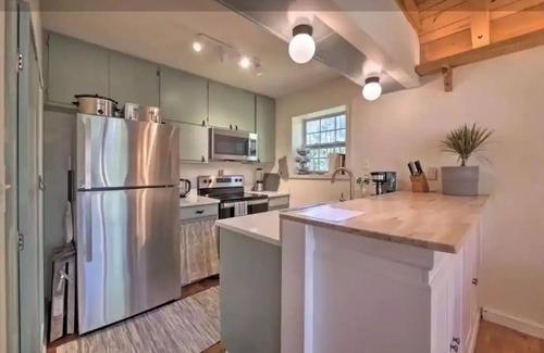 Cook family dinners in our fully-stocked kitchen and enjoy them indoors or on the deck at a 1940s Biergarten table while looking at the water. Want to grill? We have gas and charcoal grills.