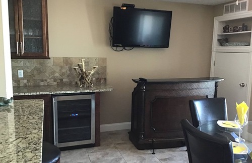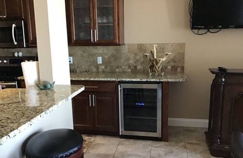 Private balcony with full lake view perfect for coffee and sunrises or glass of wine and a sunset .The fully equipped kitchen is perfect for preparing meals, with modern appliances and all the cookware and utensils you need. Dishwasher, microwave, coffee maker (Keurig and Drip/traditional), electric oven, refrigerator with ice-maker, toaster, cookware/bakeware, glassware, crock pot and dinnerware for 6. Also has a wine cooler.