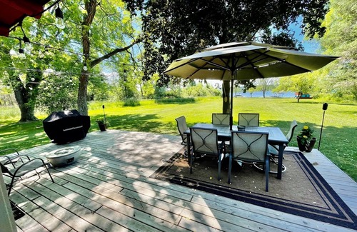 OUTDOOR LIVING: Private flat huge yard with outdoor patio with seating and propane fireplace, fire pit by water’s edge, gas grill, 2 kayaks and 2 inflatable paddle boards