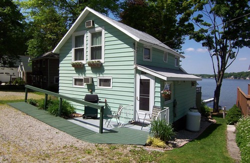 This lakefront cottage is for rent on the first basin of Lake James, one of Indiana's most beautiful sports lakes. This cottage is fully furnished with three bedrooms and one and a half baths along with an outdoor shower. The three small bedrooms [two with full-sized beds, one with a set of twin beds] and half bath are located upstairs. The living room downstairs has a full-sized pull-out couch. The front sunroom has two day beds with windows all around for enjoying beautiful Lake James sunsets. The cottage sleeps a total of 6-8 adults. The living room has high-speed internet and TV / DVD. There are remote control air conditioning units throughout the cottage. The kitchen is well-equipped with coffee maker, blender and microwave along with adjoining table area. The cottage also includes an outdoor gas grill for barbecuing, a large ground level patio with lakeside yard for games. The naturally sandy lake bottom is great for swimming, so bring all your water toys and floats. A private dock with boat tie-ups is included. (owner also has boats on the dock) Linens [bath/hand towels] and bedding included, bring your own beach towels. Two cottages, Green and Blue, are typically rented by the week in the summer time, Sat 2pm to Sat 10am. We offer these cottages by the weekend in April and Sept if no weekly bookings. We also offer for rent a 22' pontoon boat to our guests!