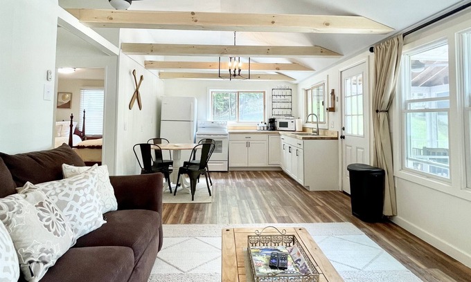 The Quaint Cottage comfortably sleeps 4 people. Open-concept living and kitchen space is fully equipped and includes a cozy dining area. The cottage is set back 20 ft from the Rustic Retreat and has a screened in porch overlooking the lake. The cottage has two cozy bedrooms and 1 bathroom. One bedroom with a memory foam queen bedroom and the second bedroom with two twin beds. Upgraded WiFi and flat screen (Roku and HD for streaming) and DVD player but no cable TV. There is also no washer/dryer but there’s a laundromat nearby.