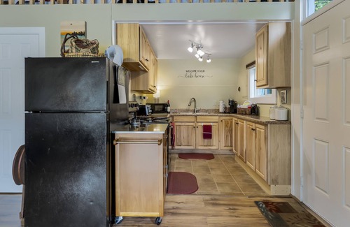 Off this main area, you'll find the King bedroom overlooking the lake, the Queen bedroom overlooking the hillside and front driveway, a large bathroom with 2 sinks, a toilet, and a shower/tub combo, as well as a stackable washer/dryer. Off the living space is also a small bathroom with a sink, toilet, and shower stall. ALL sheets/towels provided!