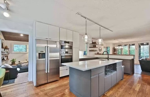 The home features an open floor plan on the main floor, all the modern kitchen appliances you need including dual ovens and an induction cooktop, two grills (gas and charcoal), a den with day-bed and beverage fridge, a breakfast nook, a coffee/tea/cocca bar (with Keurig), a powder room, and a washer/dryer.