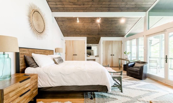 Stargazer Cabin is a modern, thoughtfully renovated lakefront home on pristine Lake Naomi, set on the historic site of a former sailing camp for girls.