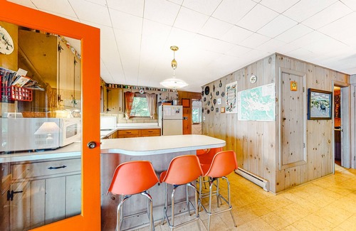 A spectacular mid-century style cottage on Lake Winnipesaukee, this retro haven is located in a quiet, family-friendly neighborhood on Spindle Point and is situated facing Stonedam Island and Cummings Cove. This is the perfect place to unwind, unplug and recharge! Enjoy lakeside living from the open-air lower deck, screened porch, or L-shaped dock complete with an 8x6 sitting area. The interior bodes authentic mid-century styling and a mix of modern conveniences and 1960s charm (with just the right amount of kitsch to keep it fun). An open floor plan combines the living room and kitchen with a breakfast bar. The kitchen is equipped with vintage china, glassware, serving pieces, and barware. The upper porch has chaises and chairs for reading or napping and a redwood picnic table for dining. There is a full bath with a shower, a gas grill, and garage access for storing your bikes. You will find excellent swimming, kayaking, water skiing, and tubing conditions. Take a scenic walk on the 1.2-mile loop around Spindle Point or the short wooded trail up Eagle Mountain; go for a run on the rolling lakeside roads; wade at the residents-only beach (just a short drive away!). Play board games or take each other on at Ping-Pong. WiFi and cable TV are provided for guests who do not want to unplug completely. This cottage has been making wonderful summer memories for the young and young-at-heart since 1963, enjoy your time here and take away your own memories.
