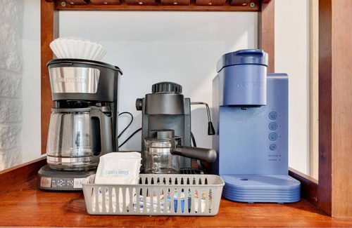 The first floor comes equipped with a coffee station for all coffee enthusiasts. Use the provided k-cups with the single serve k-cup machine or bring your own coffee and use the grinder, drip coffee, espresso, or french press machines. If you like, be sure to top off your beverage with the provided creamer and sugar.
