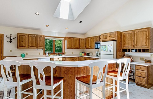 Just 50 feet from the aptly named Rest Lake, this remote home is an excellent retreat for families and groups looking to get away from it all. Lake views come easy in this lovely lakefront home. Two different living room spaces (each with a wood-burning fireplace and one with a wet bar!) means there's extra room to relax. Central air conditioning will help you cool off after a long day of lake fun. Board games are provided and a poker table is all set up for fun late nights. The incredibly spacious kitchen has plenty of space to prepare your favorite meals, and there's room for four guests to enjoy breakfast at the bar. If you'd rather cook on the private gas grill, you'll be delighted at the view from the deck. The laundry room provides plenty of space and a laundry sink (in addition to the private washer/dryer) to help take care of everyone's swimsuits. The outdoor play structure will provide hours of fun, and there's always room for one more person around the firepit.
