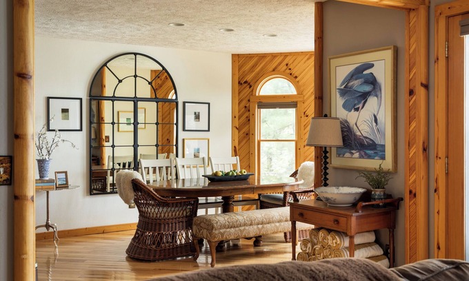 As you move upstairs, the cabin charm continues, with wood wall paneling, hand-carved staircase railings, and stained glass windows. It includes one full bathroom with a shower/tub combo and 3 bedrooms - one with a king bed, another with a queen bed, and the last with a queen bed and two twin beds. We call the last bedroom, the suite room because it’s huge! It boasts a reading corner, work area with desk and bookshelf, and an oversized closet.