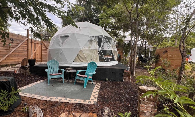 Welcome to Camp Stella our Lakefront geodesic dome with the most amazing sunsets. This property is secluded from the main home, with a private entrance & free boat parking. The dome is fully furnished with A/C and outdoor bathroom. The bathroom offers hot water and a composting toilet. There is a kitchenette with mini fridge/freezer, microwave, and coffee maker. Enjoy a magical sunset on the dock or Kayaking on Lake Stella. Reach out for additional add Ons to make your stay truly magical.
