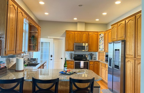 Our family-friendly haven caters to all ages, offering a selection of games, puzzles, and books for adults, in addition to children's amenities including plates, cups, utensils, a pack-n-play, booster seat, toys, books, puzzles, and life jackets. While our property is not childproof, we ensure a delightful environment for your family's enjoyment. Revel in the five-bedroom, four-bathroom abode featuring a well-equipped kitchen and a spacious game room with a big screen TV, theater seats, ping pong, foosball, air hockey, a dart board, and a wet bar. A dedicated kids' corner awaits with ball darts, bean bag toss, and board games. The "Library" invites you to unwind with a variety of books and puzzles for all ages while savoring the panoramic lake view.