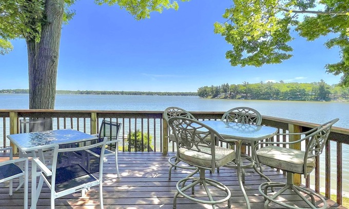 OUTDOOR LIVING: Lakefront views, private yard, deck, covered patio, dining area, ample seating, fire pit, seasonal private dock (Memorial Day-Labor Day)