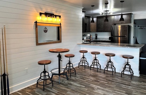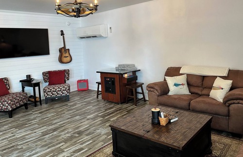 The Lakehouse Guesthouse is the perfect place to relax, fish, and chill in the hot tub after a day on Kentucky Lake! A spacious patio includes a natural gas grill, a black stone grill, and a Traeger smoker. Bring the meat! The Guesthouse is newly remodeled with a new HVAC system, new kitchen, new bathroom with tub and shower and double sink and a stack large capacity washer and dryer. Two bedrooms, both with TVs. The living room comes with an abode of entertainment, including a pool table, shuffleboard, Pacman and Galaga, a guitar, banjo, karaoke machine and a view of Kentucky Lake!