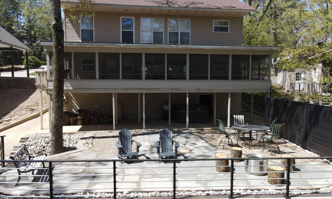 We love the outdoors at the lake . You'll love it too. There are fantastic outdoor living areas! Our comfortable screened in porch is just off the kitchen/ dining area . This space is wonderful to spend time in in the evenings and rainy days too. On the screened in back porch we have a nice table to seat 4, a swing and a comfy chair. Take the stairs off the screened in porch and head to a beautiful stone patio area with plenty of space to relax and enjoy beautiful lake views. From this back patio you can walk down to the lake. We have a nice SOLO Stove to make small fires and roast marshmellows and smores!