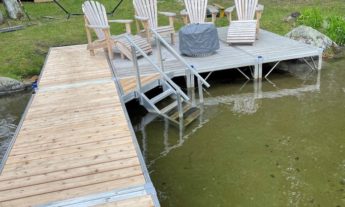Beautiful year round waterfront home located on McGrath Pond accommodates up to 17 people. Air conditioned throughout, WIFI and Cable TV. Main level has open floor plan, family, dining area, bathroom, mudroom and fully equipped kitchen, elevated deck. Upstairs has master bedroom and bath, second bedroom with ensuite, third and fourth bedrooms with a shared full bath. Downstairs in-law suite has a bunk room, with 7 beds, large family room, and kitchenette with private entrance and patio. Washer and dryer located on main level. Front entry has covered porch and elevated deck overlooking the lake.