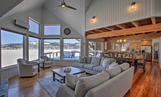 Experience lakefront living at its best when you book this 5-bedroom, 4-bathroom vacation rental home on the southern end of Lake Coeur d’Alene! ‘Lake Escape’ boasts an outdoor living/entertaining space with a hot tub, private dock, and lake access. Take off from your backyard and set a course up to Coeur d’Alene or the various communities in Worley! When you’re not out on the water, enjoy the panoramic views from the window-lined living space, gourmet kitchen, or private studio.