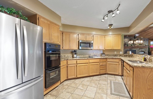 Inside the cabin has lodge style rustic furniture, comfortable beds and sofas, complete kitchen w/double convection oven, 2-fridges, 2-freezers, dishwasher, microwave, tile floor, granite countertops, etc. Also equipped with wifi, 65" large screen TV, and billiard table. Outside, lawn, beach and dock w/covered boat slip, hot tub, fire ring, awesome lake views from 2 large decks for outdoor meals, BBQ, and lounging. Two nearby golf courses, 10-15 minutes away.