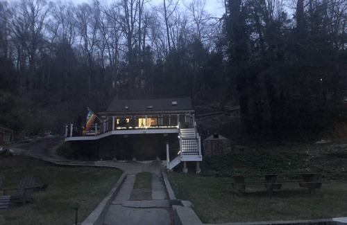 Open and airy cottage with beautiful kitchen with white marble countertops and stainless steel appliances. vaulted ceilings open to living room which includes comfortable sleeper sofa. climb up to the loft for 2 extra guests. Expansive back deck with dining table and sitting area with fire table that overlooks lake Zoar. Take the kayaks out from your lakeside back yard or just relax in your Adirondack chairs around the fire pit and watch the sunset over the lake or boats go by. Fish from private dock. outdoor pool table at the lakefront as well as picnic table. Plenty of outdoor space to enjoy what lake Zoar has to offer. Master bedroom has queen size Marriott bed with top end bedding for extreme comfort. All bedrooms are tiny. Sitting porch with additional seating area and extra tv. Note the property has a lot of stairs and may not be suitable for everyone. Loft with 2 twin beds is accessible by ladder-like steps as shown in picture.