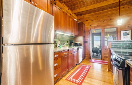 Inside your retreat, soaring ceilings, exposed beams, stone accents, and wood floors create a rustic-chic lodge vibe, while large windows showcase beautiful lake views. Unwind and watch a movie in the living area or break out the provided board games for some good old-fashioned fun. Detailed with a stylish green tile backsplash and a full suite of stainless steel appliances, the well-equipped kitchen makes it easy to prepare meals for your entire group. The adjacent stone cottage offers two additional sleeping areas, a dining area, and a wet bar.
