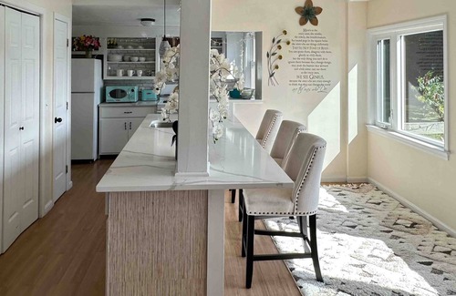 The fresh, clean, light-filled interior will make you feel welcome no matter the season, while the second-floor deck provides the perfect place to savor your morning coffee and wind down at sunset as ducks and swans swim by. Back inside, you'll find a charming kitchen with quartz countertops, space to dine with a view of the lake at both the breakfast bar and the circular dining table, and a living room with a TV for your evening entertainment. The primary bedroom upstairs boasts spectacular views of the lake as well.