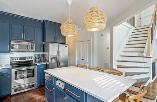The home's interior features modern farmhouse-style decor, with high-end appliances and bespoke finishes for a truly elegant vacation experience. Multiple living areas offer plenty of room to spread out. The impressive full kitchen is equipped with sparkling stainless steel appliances and ample counter space, making it easy to plan family-style feasts. Everyday essentials include central air-conditioning, free WiFi, and a private washer/dryer.