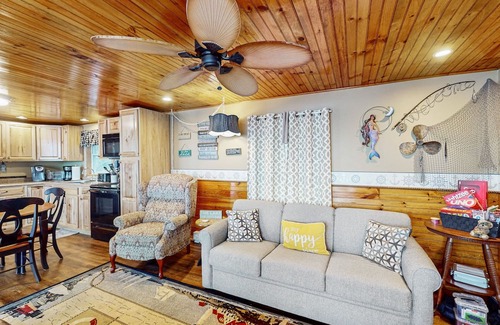 Inside, discover a quaint open floor plan with coastal decor throughout. Prepare exquisite homemade meals in the well-appointed kitchen and, once mealtime is over, retreat to the welcoming living area featuring a sofa bed and a Roku smart TV. The main floor also houses one bedroom. The entrance to the second bedroom, half bathroom, and laundry room is under the deck in the basement. The bedroom has a Roku smart TV and a brand-new window air conditioner.