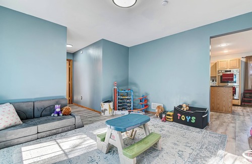 On the main floor of this house, guests will find a spacious dining table and a high chair, perfect for family meals. The modern kitchen is open-plan and equipped with a double oven and all the necessary cooking utensils. For younger visitors, there is a dedicated playroom that comes complete with toys, a futon, a playpen, and a TV featuring subscriptions to popular channels such as Disney Plus, Hulu, Roku, and ESPN. Safety gates are also provided for added peace of mind. Additionally, there is a second room and a full bathroom on this level. The cozy living room boasts a large leather sofa and a big-screen TV, with Disney Plus, Roku, Hulu, and ESPN for our valued guests.