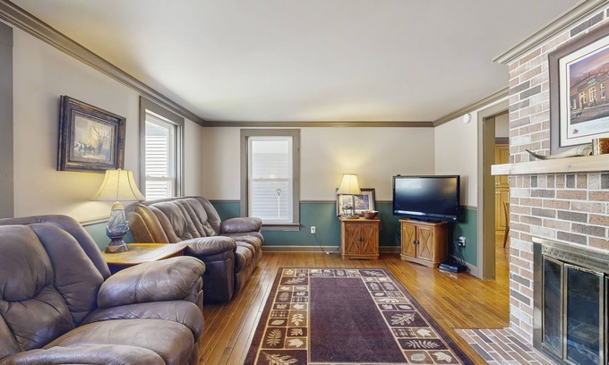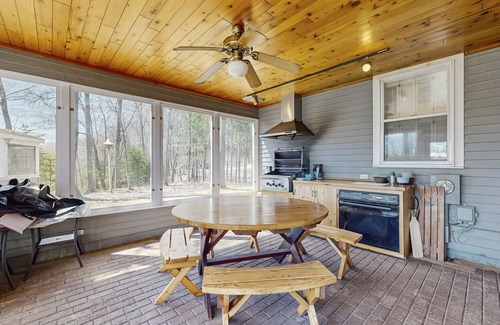 Wild Forest is a spacious, well-equipped home ready to be your home base for your next family trip to Harshaw! This two-story home is a dream come true for sports enthusiasts. On the first level, you'll see a spacious bedroom with one bathroom and a wet bar. You already can tell boredom has no place at this lakefront retreat. As you move up to the second level and central area, you'll find a fancy dining area and a well-equipped kitchen with gorgeous granite countertops, a kitchen island, and all the appliances and utensils needed to whip up memorable meals and snacks for the whole family. Continue your tour through the house and unwind in the living area, conveniently equipped with inviting sofas in front of the wood-burning fireplace and TV.