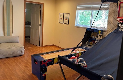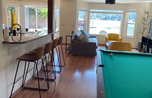 Lake Front Living! Fishing! Boating! Swimming! Hiking trails! Bike to town! 2 downstairs dining areas. Lots of seating for eating, games or puzzles! 3 KING BEDS, 4 twin beds and 2 sets of bunk beds- with 4 full bathrooms! Extra Large Game room with pop a shot, skee ball and a pool table! Upstairs TV room! Barbecue and outdoor firering for s’mores! Enjoy beautiful sunsets off of the lake! So many family memories! Also CLOSE to 3 SKI RESORTS! Come SKI IN THE WINTER!