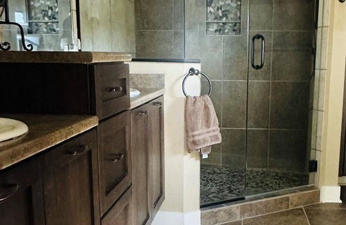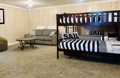 The lower lake level is like a private section of the house with its own kitchenette consisting of a mini-refrigerator, coffee pot, microwave, sink, and pantry. There's a queen bedroom on this floor along with a separate full bathroom. The final bedroom is a large bunk room with two sets of bunk beds and a full bed. There's plenty of room for your air mattresses or sleeping bags in this room.