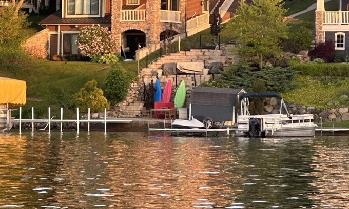 Earthen steps and pavers wind down the hill to the lakefront. Great swimming area, expect a sandy bottom with stones and shells (water/swim shoes highly recommended). Expansive dock with sitting area. Shared dock with owners for access to boat. Lake toys, large swim pad, kayaks (ride-on and sit-in), paddle boat, & foam noodles. Bring your lake floaties and lounge in the sun!