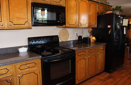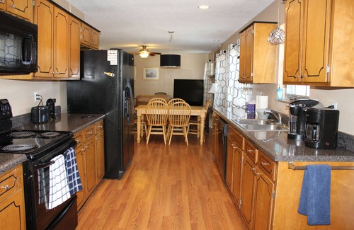 The 5 acre flat, mowed property borders a nature preserve on 2 sides. Enjoy watching the birds, deer , chipmunks and you kids and pets from the back patio. The home sits off the road and is landscaped beautifully with several Japanese maple trees. There is plenty of parking beside the house and in a separate gravel parking lot in the back yard. 12 cars are easy to park here. Unbelievably the house has extremely, high speed wireless internet. The Convenient kitchen has a large refrigerator freezer with ice and water through the door. The galley kitchen includes an electric stove and oven, microwave, dishwasher , toaster, and coffee maker.