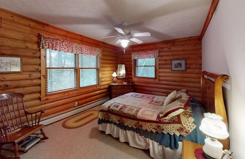 The main floor of the lodge is open & spacious, with an air-conditioned kitchen, living and dining space. The custom kitchen has a large breakfast bar, desktop work space, and new appliances. An intimate sitting area centered around a fireplace with soaring stone mantel is the focal point of the room. A sunporch just off the living room provides a quiet, comfortable spot from which to view the lake and river. There are two large queen bedrooms and one full bath with laundry area to round out the first floor. Head upstairs to the Primary suite with its own lake view seating area and full bath with whirlpool tub. There is a loft overlooking the open spaces below with a queen pull-out sofa and sitting area with a twin sleeper sofa. The walk-out basement features 3 queen bedrooms, one full bath and a media room with a massive flat screen TV. The main house can comfortably accommodate up to 12 guests.