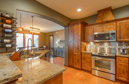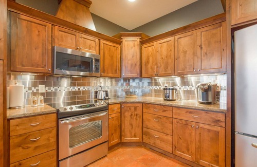 The fully-stocked gourmet kitchen features natural finish cabinetry and granite counters. Included are pots, pans, toaster, microwave, Keurig coffee maker, blender and instant-pot, cooking utensils and some seasonings. We will leave you a dozen of our favorite K-cups, but feel free to bring your own stash of coffee and seasonings as well!