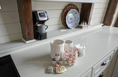 Keurig and Keurig-style coffee maker in kitchen (starter pack of K-Cups, creamer, and sugar variety provided)