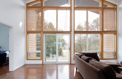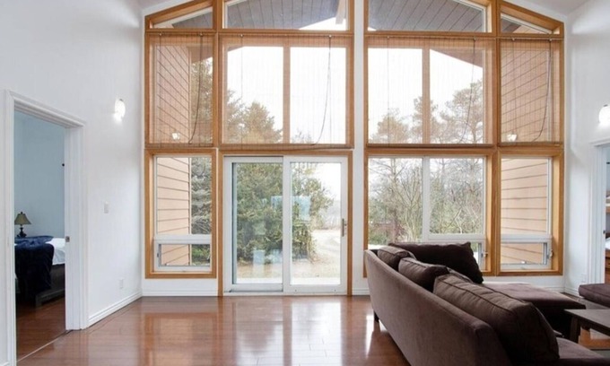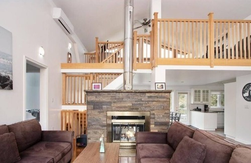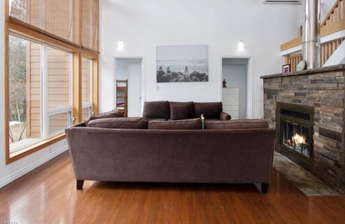 On the main floor you will enjoy the open concept living room with beautiful high ceilings with glorious amount of natural light throughout the entire day. During the winter, you can enjoy a double sided wood burning fireplace and heated floors throughout the cottage.