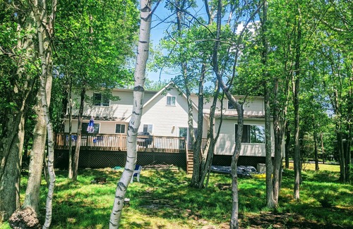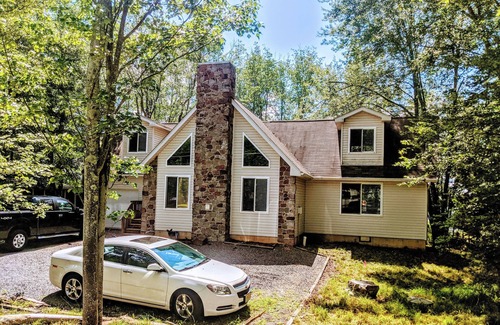 From our family to yours, come make memories in this cozy lakefront retreat in the Gold Star community of Arrowhead lake, located in the Pocono Mountains. Wake up on the lake with gorgeous views in this cape cod style home with cathedral ceilings and rustic wood beam rafters, giving the home a mountain feel. Swim and fish right off of the home's private dock. The home is located in prime community location. The home is just a stone throw or swim, one home over, to the community beach [beach 4] and playground. Central location, with ease of access to the three heated community pools. This 3 bedroom home is with 2.5 baths and bonus playroom, which is set-up as an extra dual bedroom/playroom, is perfect for a family getaway. Home is complete with playroom, containing every board game imaginable, Dvds, and book collection. Games for kids, free WiFi, TVs are set up with Netflix, Hulu, and Disney Plus. Deck with grill and a fire pit are set up for outdoor enjoyment, dining, and s'mores for days. Sleeps up to 12, which is perfect for one or more families. Paddle boat, kayaks, raft, swimming tubes, and some fishing gear available on the property for use and enjoyment of the property. Multiple amenities located within the community will keep everyone busy. Multiple tourist attractions located within driving distance.