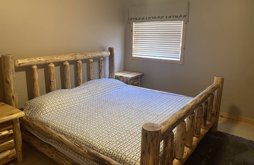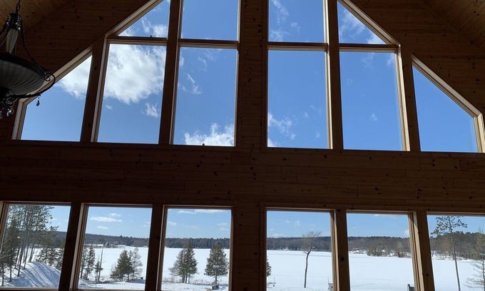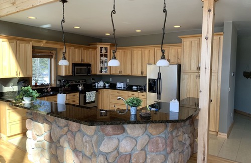 Come stay in an almost 4,000 square foot house on a private lot of almost 12 acres on All-Sports McCollum Lake. The house features open cathedral ceilings and beautiful wood finishes on the walls and flooring. Walk into an open floor plan with a fully stocked kitchen and large living/dining room, with views of the lake from the many large windows. Enjoy a relaxing evening in the living room by the fireplace. Off of the living room is a walkway that leads to an octagon shaped deck with views of the lake. The master bedroom has a king bed with on suite and jacuzzi tub are on the main floor as well. The upstairs features an open loft leading into a bedroom wih twin over twin bunk beds. The downstairs has a second kitchen with living/dining room. It is a walkout to the large yard leading to the lake. There are 2 bedrooms with king beds in the basement as well. This house is big enough to enjoy yourself and have some privacy for larger groups/families. There is laundry on the main floor as well as an attached garage. Above the attached garage is a bonus game room.