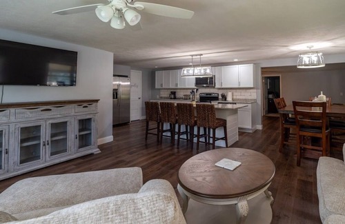Beautiful remodeled lakefront property. 5 bedroom/3 bath. Master suite has King Bed and private master bath with walk in shower. Bedroom 2 has a queen size bed, bedrooms 3 and 4 have queen beds with lake views. Bedroom 5 has a full bed. Screened in back porch. Basement with pool table and built in bar coming off the lake. Washer/Dryer. Kitchenware and bathroom necessities provided for your convenience. Easy access to Marion, IL, golf courses, restaurants and local marinas by boat and road. Great location to host a family getaway, girls trip or just a quiet getaway for fishing, boating and relaxing. 10 minutes from I57/I24. Boat rental upon request.