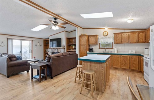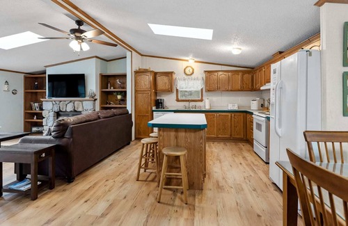 This inviting 1,664 sq ft lakefront retreat is the perfect escape for families and groups, offering breathtaking views and plenty of space to relax and connect. The open kitchen features a cozy breakfast nook for morning coffee and an island perfect for meal prep. It seamlessly flows into the living area, where you can unwind by the electric fireplace or catch a movie on the 55” HD TV.