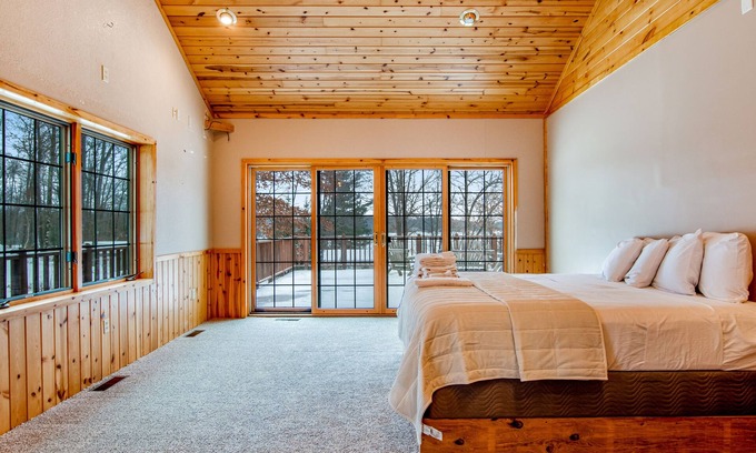 The ultimate group getaway awaits at this sprawling waterfront retreat, complete with a deck, dock access and a convenient boat slip. Idyllic East Horsehead Lake presents 185 acres of beautiful, clear water perfect for your favorite lake activities. Grill out for dinner, then gather around the firepit by the beach!