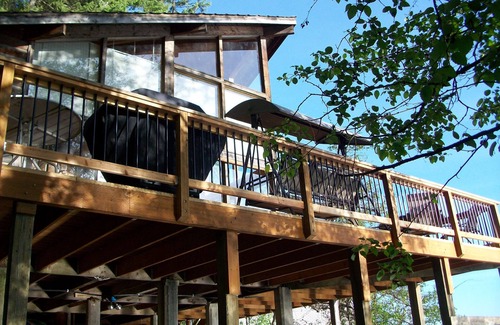 The dock to sunbath on or tie up your boat for all of your play is located directly below the cabin. The cabin also has a large deck with swing, table and bench seating all around to enjoy the vista's and watch your friends and family below in the water. A barbecue on the deck makes outdoor cooking a breeze and a pebble beach with sloped entry into the water enables easy beach play.